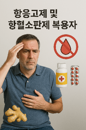 생강은 혈액 응고를 지연시키는 특성이 있어, 와파린, 아스피린, 헤파린 등의 항응고제와 함께 섭취할 경우 출혈 위험이 높아질 수 있습니다.