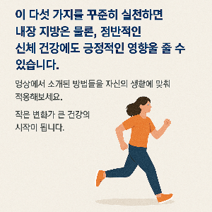 이 다섯 가지를 꾸준히 실천하면 내장 지방은 물론, 전반적인 신체 건강에도 긍정적인 영향을 줄 수 있습니다. 영상에서 소개된 방법들을 자신의 생활에 맞춰 적용해보세요. 작은 변화가 큰 건강의 시작이 됩니다.