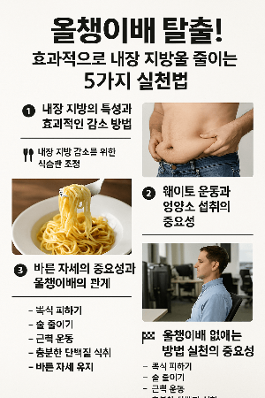 건강한 삶을 위한 첫걸음은 바로 내장 지방 관리입니다. 내장 지방은 피하지방과 달리 더 빠르게 줄일 수 있으며, 간단한 생활 습관 교정만으로도 큰 효과를 볼 수 있습니다. 특히 올챙이배로 고민하는 분들이라면, 지금 소개해드리는 다섯 가지 방법을 실천해보세요. 자세, 식습관, 운동, 영양 섭취까지 전반적인 건강을 챙길 수 있는 핵심 가이드를 알려드립니다.